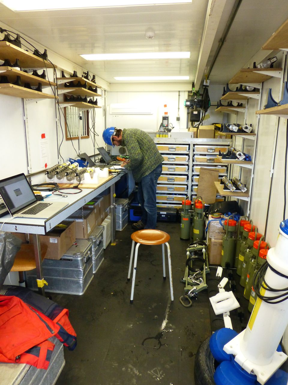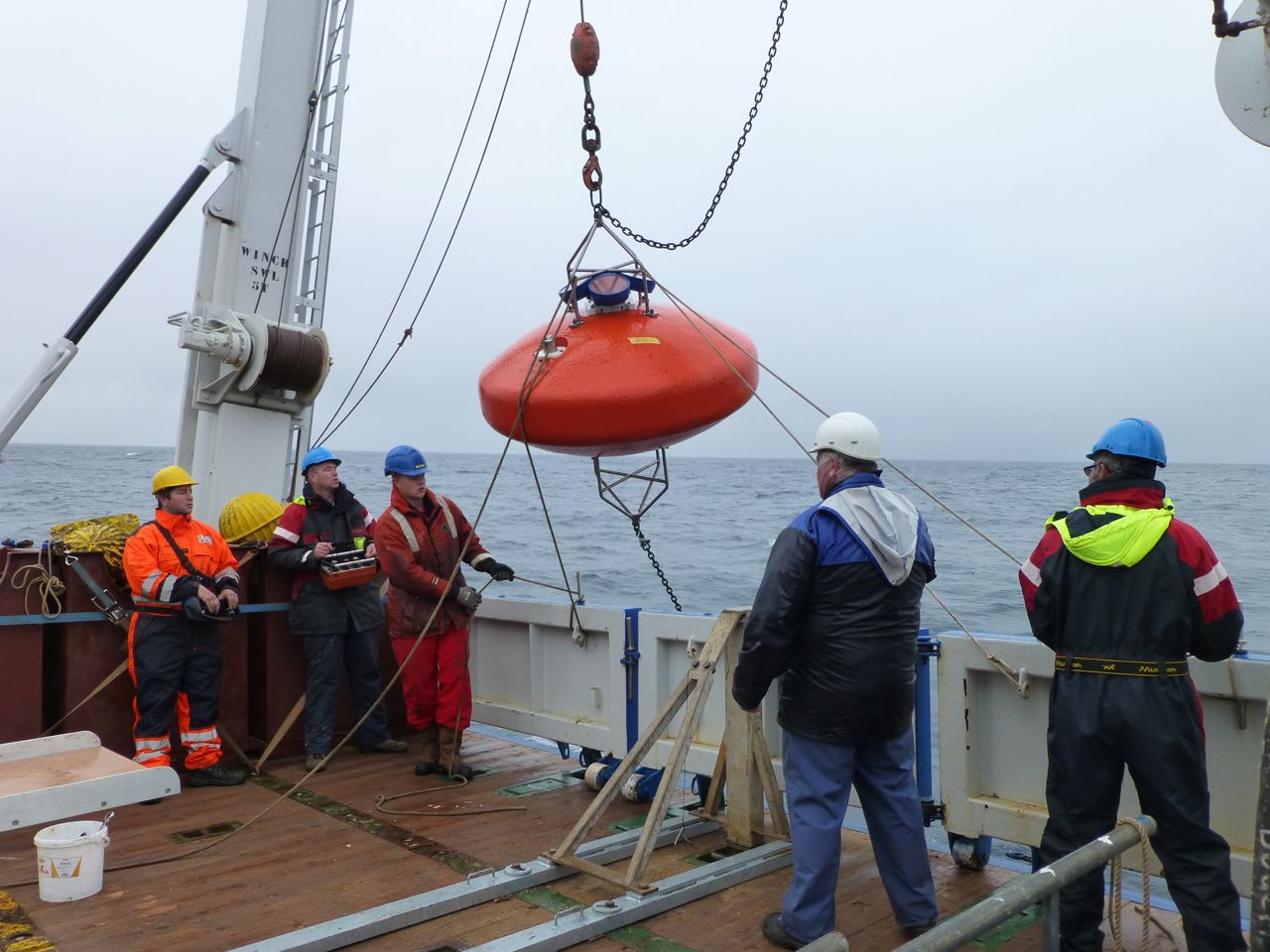 As mentioned before, the recovery of the first moorings on this cruise was very successful: all but one instrument on the 5 Dutch moorings in the Irminger Current had recorded data for one whole year. The large data return of ocean temperature, salinity and velocity at 15 minutes to one hour intervals at selected depths between 100 m and 2900 m depth allows us to investigate the northward flowing Irminger Current. Earlier estimates were derived from summer data (shipboard data) only. Now we can quantify the total volume and heat transport of the Irminger Current based on these continuous measurements, address seasonality, and investigate variability in relation to e.g. atmospheric patterns. After retrieving our data, the instruments have been serviced, batteries replaced, and the moorings are deployed again on the Reykjanes Ridge – ready to collect another year of data. We are now working our way westward in the Irminger Sea and have reached the English moorings in the Deep Western Boundary Current, the cold and dense current flowing southward. Cross our fingers for another few days with good mooring recoveries!