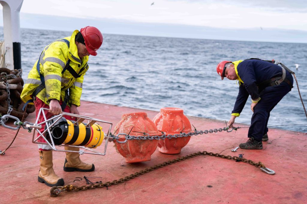 Steve and John are the two men who work at the edge of the fantail, guiding and sometimes pulling in the enormous buoys, chains, and fragile scientific sensors that comprise the moorings. The deck is noisy, but the two know one another’s moves so well that there seems to be little need for conversation. One moment they are using brute force to hoist in a chain of buoys that’s gotten stuck at the edge of the ship, and the next moment they are nimbly untangling a sensor from the line. Time and again I watch as John gently holds an microcat while Steve carefully unscrews the bolts that have anchored it to the line. Though there is a clear routine to the work, small surprises and dilemmas abound and the pair handles each one with care but without concern. If words are exchanged at all they usually seem to be in the form of a joke.